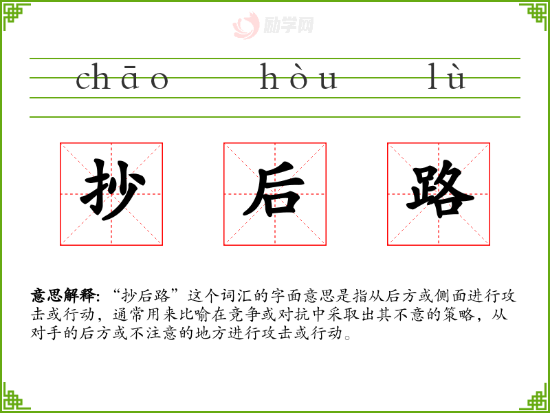 “抄后路”这个词汇的字面意思是指从后方或侧面进行攻击或行动,通常用来比喻在竞争或对抗中采取出其不意的策略,从对手的后方或不注意的地方进行攻击或行动。