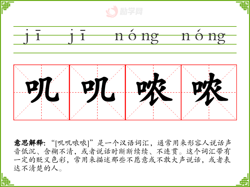 “叽叽哝哝”这个词汇在描述沟通方式时非常有用,它不仅传达了声音的特点,还暗示了说话者的情感状态和性格特征。在我的语言学*和表达中,理解这个词汇的含义和用法,有助于我更准确地描述和理解他人的沟通行为。