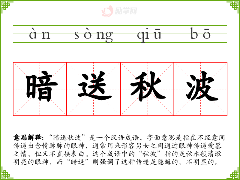 “暗送秋波”是一个汉语成语,字面意思是指在不经意间传递出含情脉脉的眼神,通常用来形容男女之间通过眼神传递爱慕之情,但又不直接表白。这个成语中的“秋波”指的是秋水般清澈明亮的眼神,而“暗送”则强调了这种传递是隐晦的、不明显的。