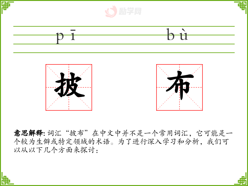 词汇“披布”在中文中并不是一个常用词汇,它可能是一个较为生僻或特定领域的术语。为了进行深入学*和分析,我们可以从以下几个方面来探讨: