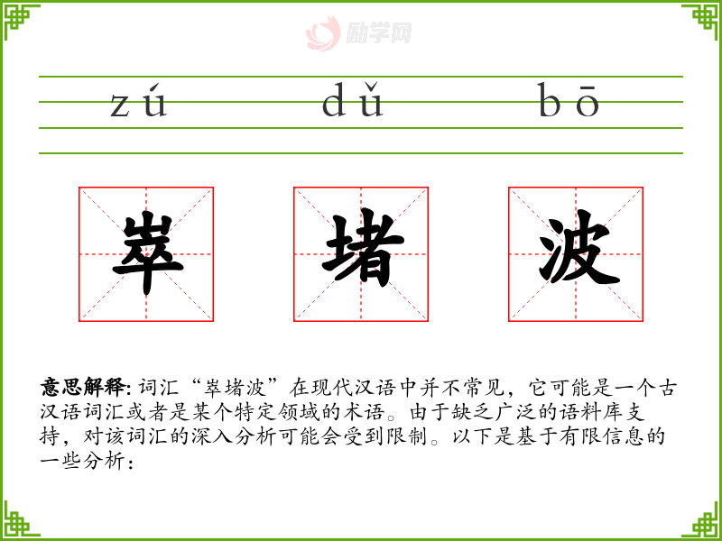 词汇“崒堵波”在现代汉语中并不常见,它可能是一个古汉语词汇或者是某个特定领域的术语。由于缺乏广泛的语料库支持,对该词汇的深入分析可能会受到限制。以下是基于有限信息的一些分析: