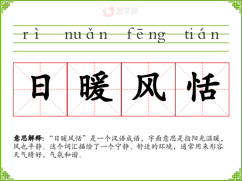 “日暖风恬”是一个汉语成语,字面意思是指阳光温暖,风也平静。这个词汇描绘了一个宁静、舒适的环境,通常用来形容天气晴好,气氛和谐。