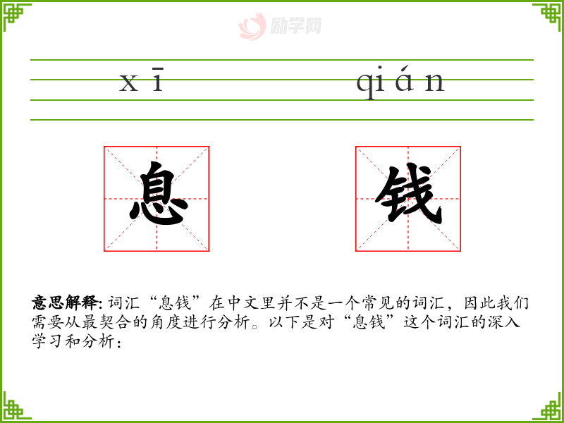 词汇“息钱”在中文里并不是一个常见的词汇,因此我们需要从最契合的角度进行分析。以下是对“息钱”这个词汇的深入学习和分析: