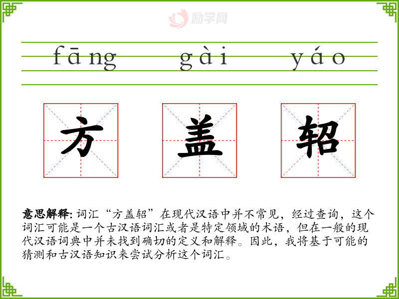 词汇“方盖轺”在现代汉语中并不常见,经过查询,这个词汇可能是一个古汉语词汇或者是特定领域的术语,但在一般的现代汉语词典中并未找到确切的定义和解释。因此,我将基于可能的猜测和古汉语知识来尝试分析这个词汇。
