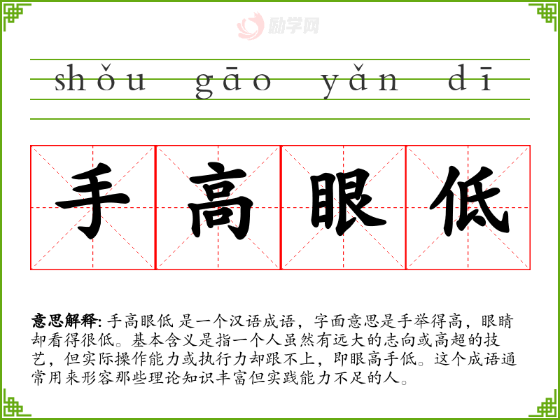 手高眼低 是一个汉语成语,字面意思是手举得高,眼睛却看得很低。基本含义是指一个人虽然有远大的志向或高超的技艺,但实际操作能力或执行力却跟不上,即眼高手低。这个成语通常用来形容那些理论知识丰富但实践能力不足的人。