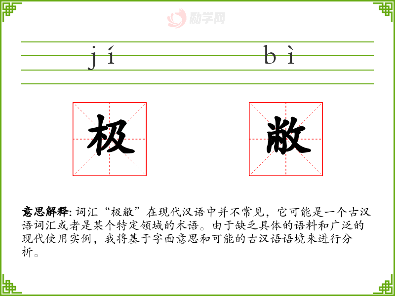词汇“极敝”在现代汉语中并不常见,它可能是一个古汉语词汇或者是某个特定领域的术语。由于缺乏具体的语料和广泛的现代使用实例,我将基于字面意思和可能的古汉语语境来进行分析。