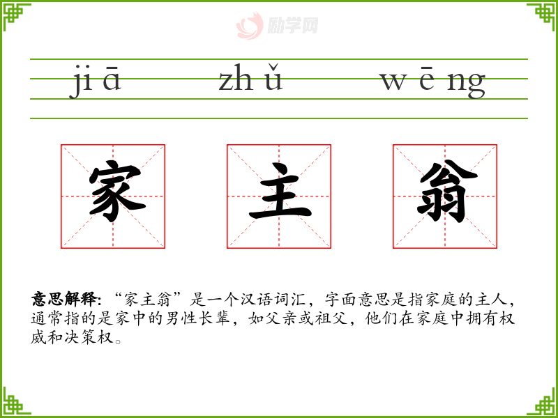 “家主翁”这个词汇不仅是一个语言符号,更是文化和历史的载体。在学和使用这个词汇时,我们不仅是在学一个词语,更是在理解和尊重一种文化传统和家族价值观。
