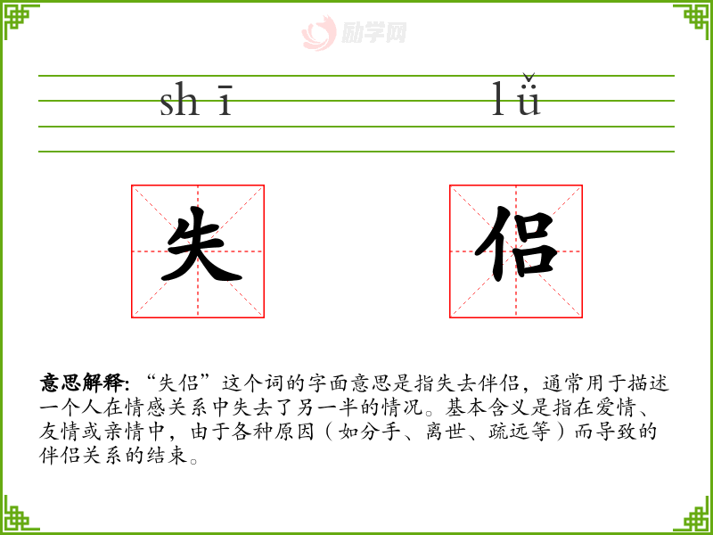通过对“失侣”这个词的深入学习和分析,我更加理解了它在不同语境中的使用和含义。这个词不仅描述了一个情感状态,还反映了社会和文化对个体情感经历的影响。在语言学习和表达中,理解这样的词汇能够帮助我们更准确地传达情感和思想,增强语言的表达力。