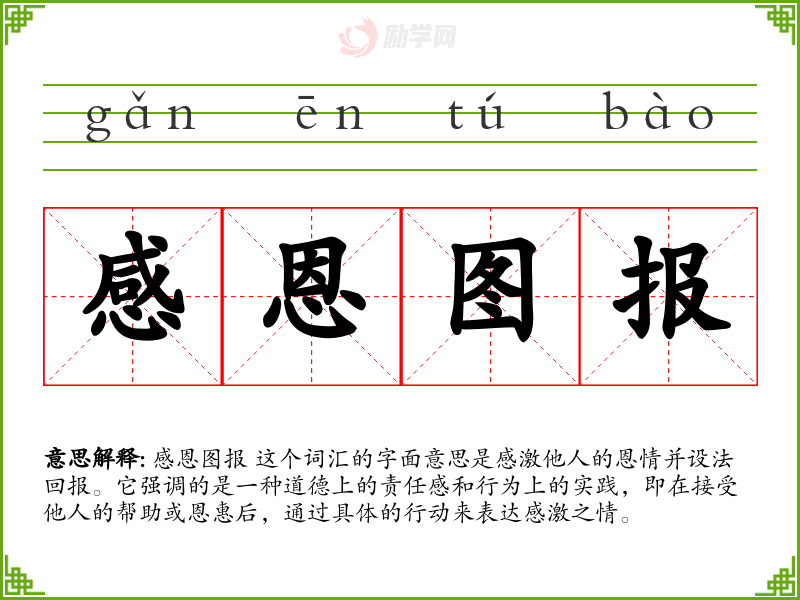感恩图报 这个词在我语言学和表达中非常重要,它不仅帮助我理解人际关系中的互惠原则,还鼓励我在生活中实践这种美德。通过学和使用这个词,我更加意识到在社会交往中保持感恩和回报的重要性。
