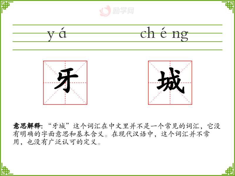 “牙城”这个词汇在中文里并不是一个常见的词汇,它没有明确的字面意思和基本含义。在现代汉语中,这个词汇并不常用,也没有广泛认可的定义。