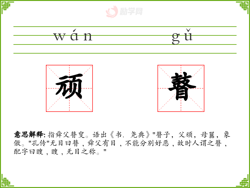 1.指舜父瞽叟。语出《书.尧典》"瞽子,父顽,母嚚,象傲。"孔传"无目曰瞽﹐舜父有目﹐不能分别好恶﹐故时人谓之瞽﹐配字曰瞍﹐瞍﹐无目之称。"