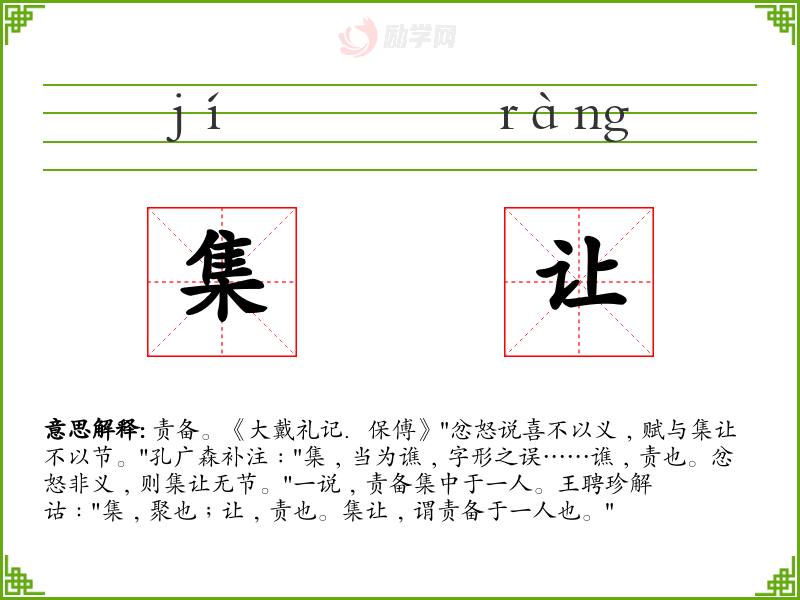 责备。《大戴礼记.保傅》"忿怒说喜不以义﹐赋与集让不以节。"孔广森补注﹕"集﹐当为谯﹐字形之误……谯﹐责也。忿怒非义﹐则集让无节。"一说﹐责备集中于一人。王聘珍解诂﹕"集﹐聚也﹔让﹐责也。集让﹐谓责备于一人也。"