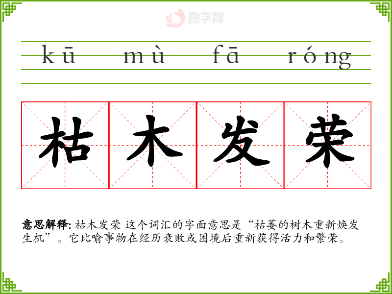 枯木发荣 这个词汇的字面意思是“枯萎的树木重新焕发生机”。它比喻事物在经历衰败或困境后重新获得活力和繁荣。