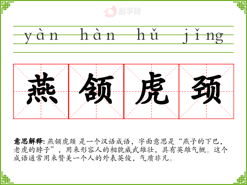 燕颔虎颈 是一个汉语成语,字面意思是“燕子的下巴,**的脖子”,用来形容人的相貌威武雄壮,具有英雄气概。这个成语通常用来赞美一个人的外表英俊,气质非凡。