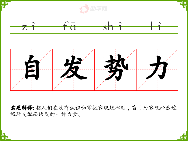 自发势力的意思是:指人们在没有认识和掌握客观规律时﹐盲目为客观必然过程所支配而诱发的一种力量。