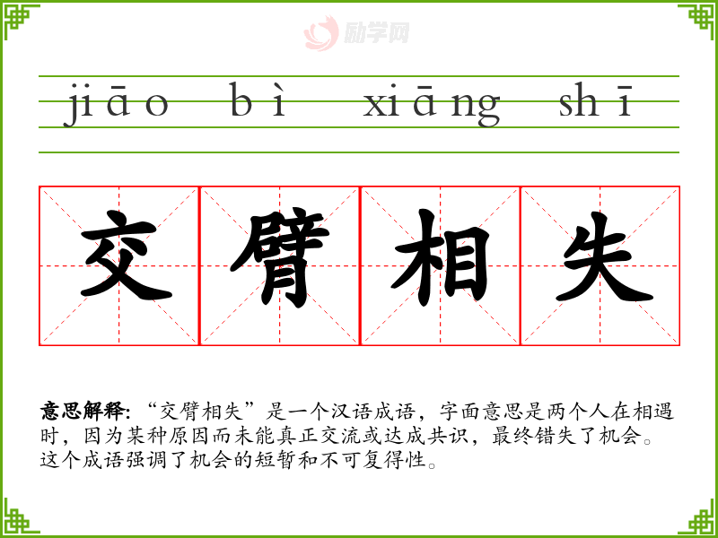 “交臂相失”是一个汉语成语,字面意思是两个人在相遇时,因为某种原因而未能真正交流或达成共识,最终错失了机会。这个成语强调了机会的短暂和不可复得性。