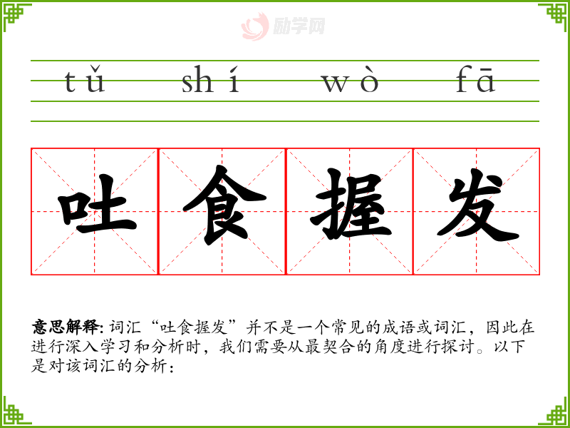 词汇“吐食握发”并不是一个常见的成语或词汇,因此在进行深入学习和分析时,我们需要从最契合的角度进行探讨。以下是对该词汇的分析: