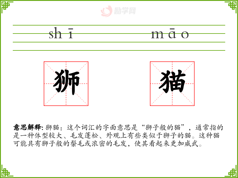 狮猫:这个词汇的字面意思是“狮子般的猫”,通常指的是一种体型较大、毛发蓬松、外观上有些类似于狮子的猫。这种猫可能具有狮子般的鬃毛或浓密的毛发,使其看起来更加威武。