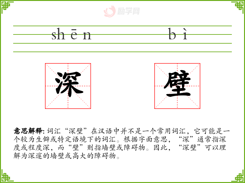 词汇“深壁”在汉语中并不是一个常用词汇,它可能是一个较为生僻或特定语境下的词汇。根据字面意思,“深”通常指深度或程度深,而“壁”则指墙壁或障碍物。因此,“深壁”可以理解为深邃的墙壁或高大的障碍物。