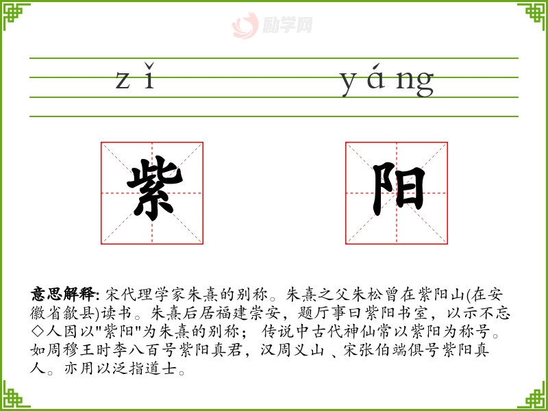宋代理学家朱熹的别称。朱熹之父朱松曾在紫阳山(在安徽省歙县)读书。朱熹后居福建崇安,题厅事曰紫阳书室,以示不忘◇人因以"紫阳"为朱熹的别称; 传说中古代神仙常以紫阳为称号。如周穆王时李八百号紫阳真君,汉周义山﹑宋张伯端俱号紫阳真人。亦用以泛指道士。