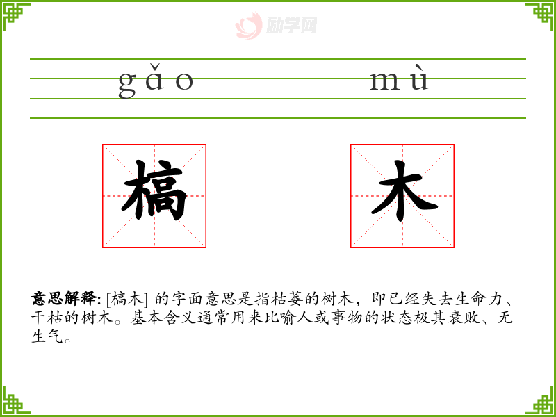 [槁木] 的字面意思是指枯萎的树木,即已经失去生命力、干枯的树木。基本含义通常用来比喻人或事物的状态极其衰败、无生气。