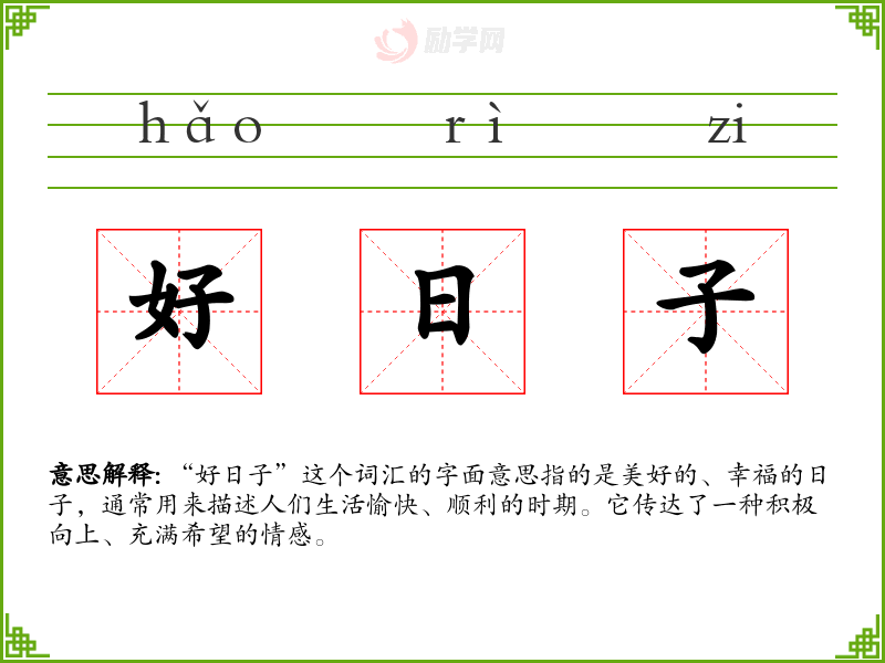 “好日子”这个词汇的字面意思指的是美好的、幸福的日子,通常用来描述人们生活愉快、顺利的时期。它传达了一种积极向上、充满希望的情感。