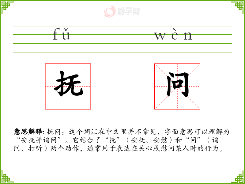 抚问:这个词汇在中文里并不常见,字面意思可以理解为“安抚并询问”。它结合了“抚”(安抚、安慰)和“问”(询问、打听)两个动作,通常用于表达在关心或慰问某人时的行为。