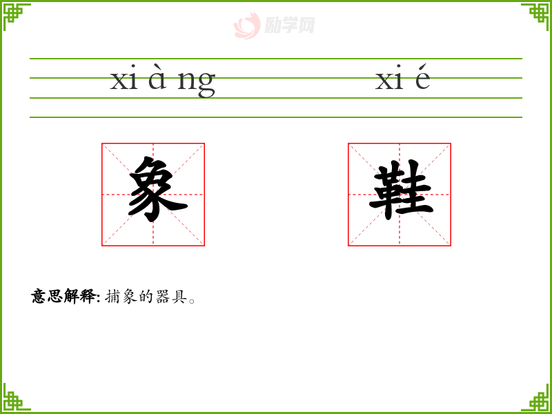 (象形。甲骨文字形,突出其长鼻。本义:大象,一种哺乳动物)。