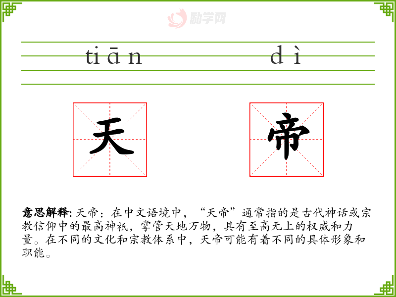 - 同义词:天神、上帝、玉帝(道教中的天帝)