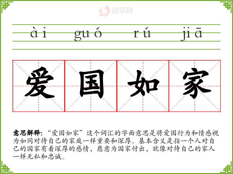 “爱国如家”这个词汇的字面意思是将爱国行为和情感视为如同对待自己的家庭一样重要和深厚。基本含义是指一个人对自己的国家有着深厚的感情,愿意为国家付出,就像对待自己的家人一样无私和忠诚。