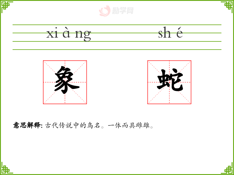 象蛇的意思是:古代传说中的鸟名。一体而具雌雄。