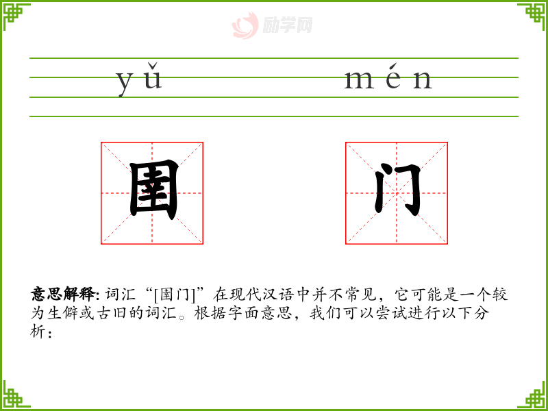 词汇“[圉门]”在现代汉语中并不常见,它可能是一个较为生僻或古旧的词汇。根据字面意思,我们可以尝试进行以下分析: