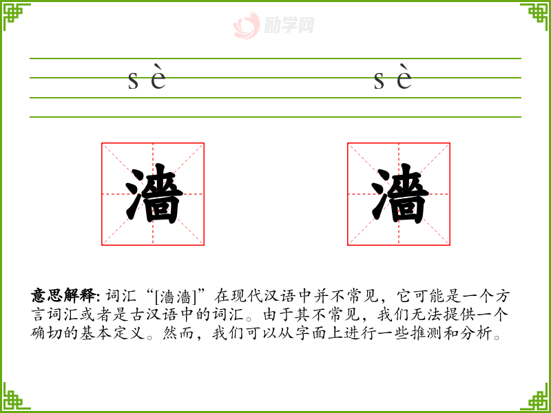 词汇“[濇濇]”在现代汉语中并不常见,它可能是一个方言词汇或者是古汉语中的词汇。由于其不常见,我们无法提供一个确切的基本定义。然而,我们可以从字面上进行一些推测和分析。