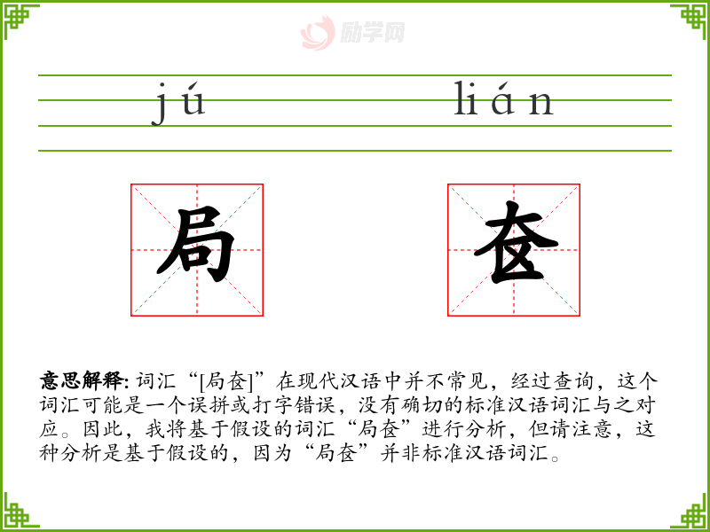 词汇“[局奁]”在现代汉语中并不常见,经过查询,这个词汇可能是一个误拼或打字错误,没有确切的标准汉语词汇与之对应。因此,我将基于假设的词汇“局奁”进行分析,但请注意,这种分析是基于假设的,因为“局奁”并非标准汉语词汇。