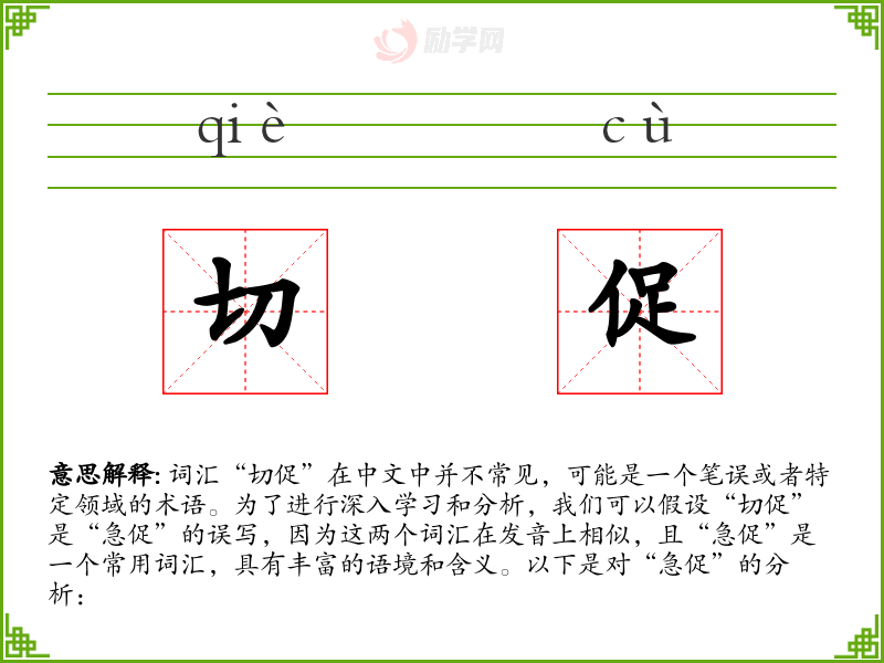 通过以上分析,我们可以看到“急促”这个词汇在不同语境中的应用和意义,以及它在语言表达中的重要性。如果“切促”确实是一个特定领域的术语,那么上述分析可能不完全适用,但可以作为一个参考框架来理解类似词汇。