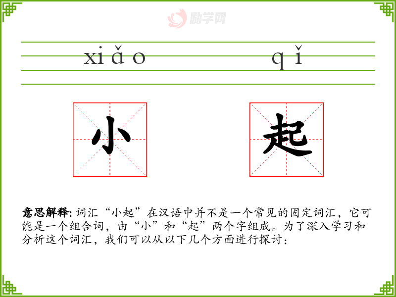 词汇“小起”在汉语中并不是一个常见的固定词汇,它可能是一个组合词,由“小”和“起”两个字组成。为了深入学*和分析这个词汇,我们可以从以下几个方面进行探讨: