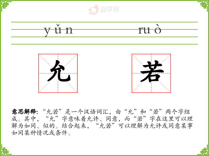 在文学作品中,“允若”可能用于表达一种条件性的同意或承诺,例如“允若你完成这项任务,我将给予你奖励”。在口语中,这个词汇可能不太常用,但在正式或法律文件中,它可能出现,用以表达一种正式的同意或承诺。