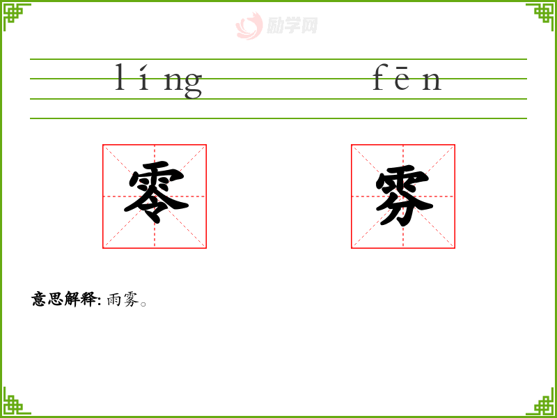 零[ líng ] 1. (形声。从雨,令声。本义:下雨。指落细雨)。 2. 同本义。 【引证】 《说文》-零,余雨也。 《诗·豳风·东山》-零雨其濛。 【组词】 零雨 [更多解释]