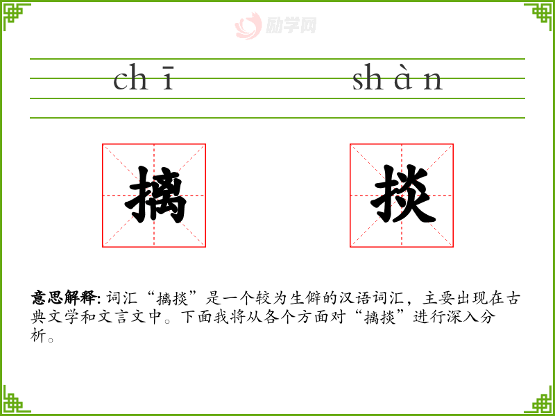 “摛掞”(chī yàn)的字面意思是铺陈、发挥,多用于形容文辞的铺展和发挥。在古代文学中,常用来形容作者在文章中充分表达自己的思想和情感。