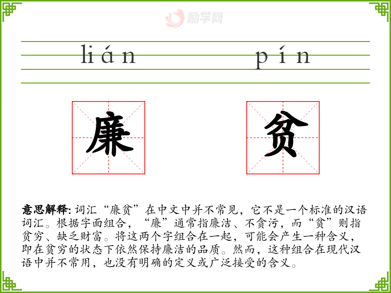 由于“廉贫”不是一个标准词汇,我们只能根据字面意思推测其含义:在贫穷的状态下保持廉洁,即不因贫穷而放弃道德原则或廉洁的行为。