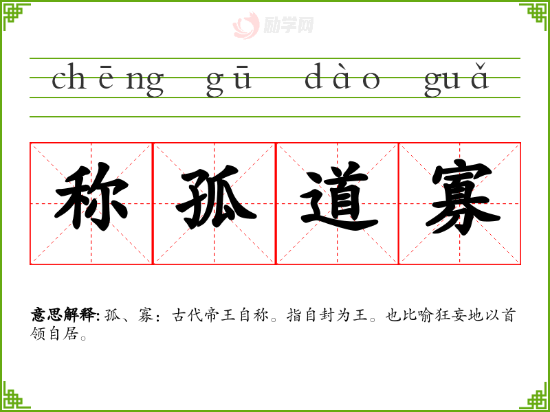 孤、寡:古代帝王自称。指自封为王。也比喻狂妄地以首领自居。