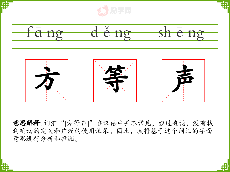 “方等声”作为一个不常见的词汇,其具体含义和使用场景需要更多的信息来确定。在语言学习和表达中,了解和掌握常用词汇更为重要,但对于特定领域的专业词汇,深入学习也是必要的。
