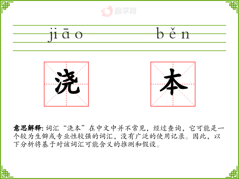 “浇本”作为一个生僻词汇,可能在特定领域有其独特的含义和应用。在语言学习和表达中,了解这样的词汇可以增加对专业知识的理解,但在日常交流中可能不常用。