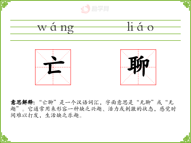 “亡聊”一词的词源较为直接,由“亡”(失去、无)和“聊”(有趣、可谈)组成。在古代汉语中,“聊”也有“依赖”的意思,因此“亡聊”也可以理解为“无所依赖”或“无所寄托”。随着时间的推移,这个词的含义逐渐固定为形容无聊的状态。