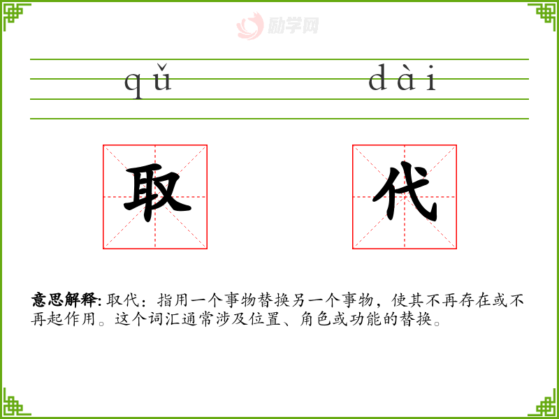 - 专业领域:在科技或工业领域,“取代”可能指新技术或新材料替代旧技术或材料的过程。