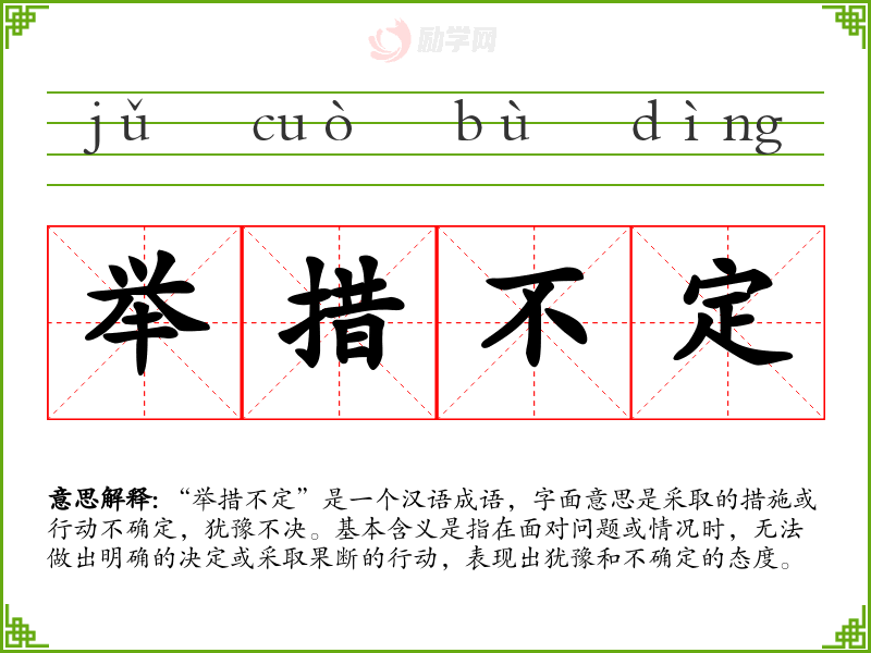 “举措不定”是一个汉语成语,字面意思是采取的措施或行动不确定,犹豫不决。基本含义是指在面对问题或情况时,无法做出明确的决定或采取果断的行动,表现出犹豫和不确定的态度。