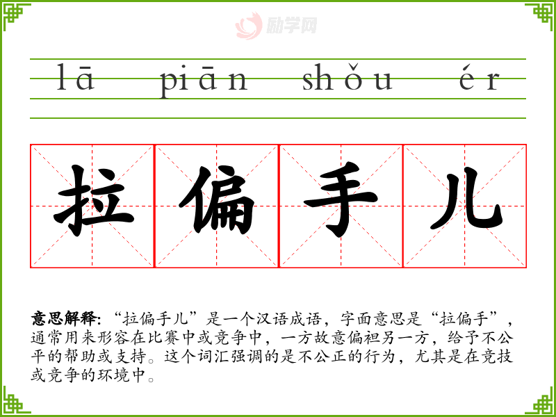 “拉偏手儿”是一个汉语成语,字面意思是“拉偏手”,通常用来形容在比赛中或竞争中,一方故意偏袒另一方,给予不公平的帮助或支持。这个词汇强调的是不公正的行为,尤其是在竞技或竞争的环境中。