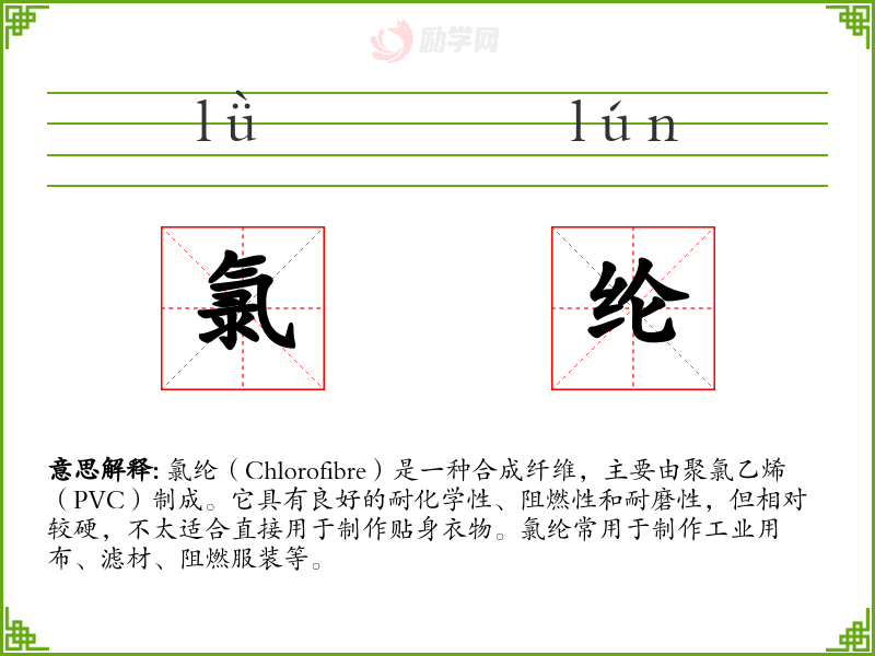 在不同语言中,氯纶的对应词汇可能会有所不同,但其基本含义和应用领域是相似的。例如,在英语中,氯纶可以被称为“Chlorofibre”或“PVC fibre”。