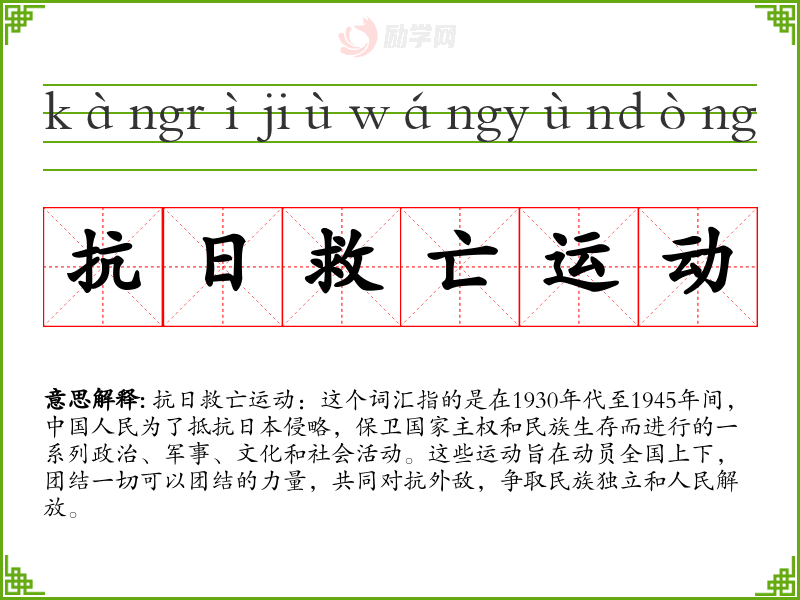 1.抗日救亡运动的拼音是什么?抗日救亡运动怎么读?