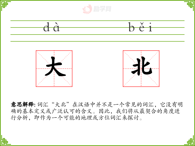 词汇“大北”在汉语中并不是一个常见的词汇,它没有明确的基本定义或广泛认可的含义。因此,我们将从最契合的角度进行分析,即作为一个可能的地理或方位词汇来探讨。